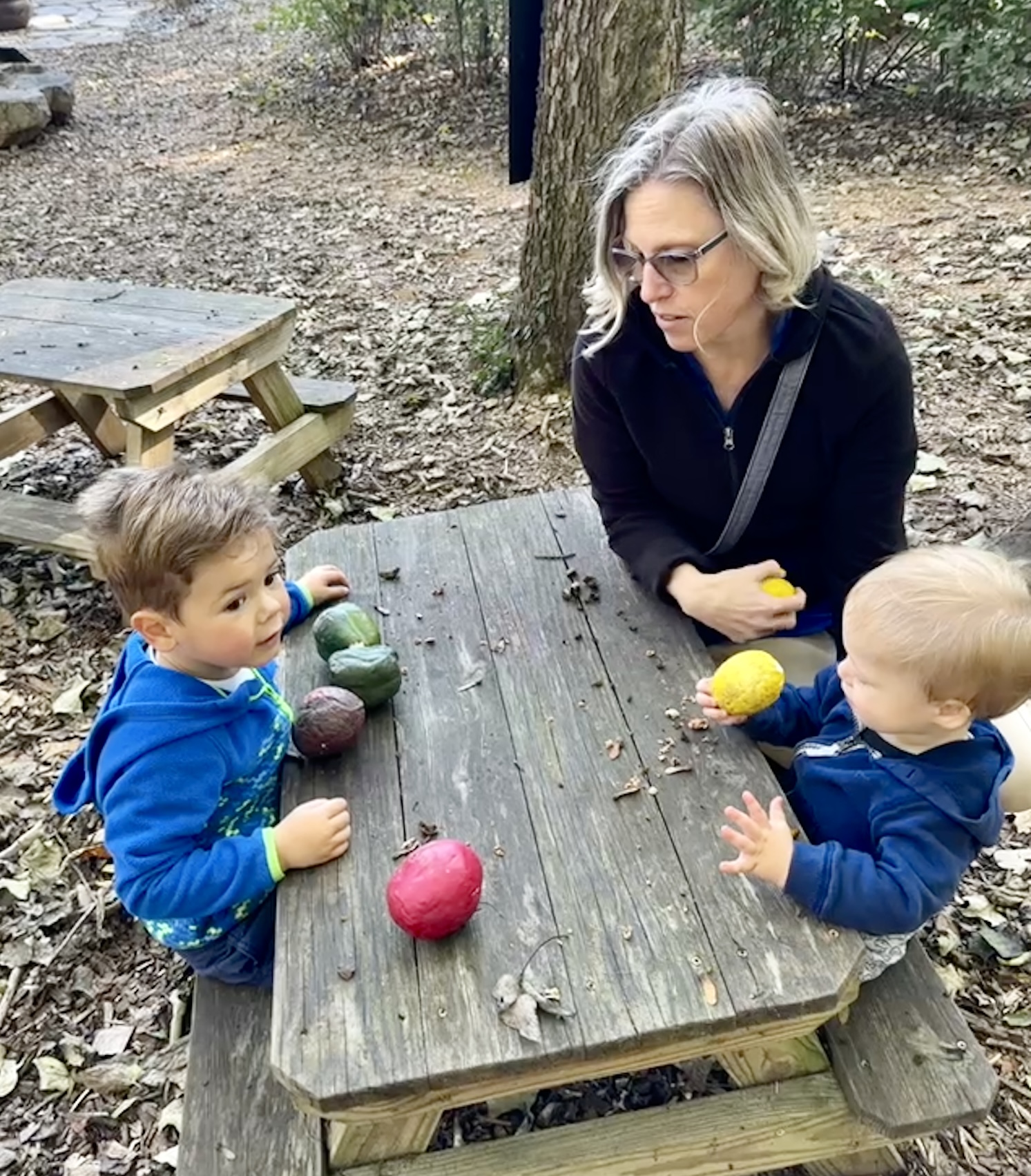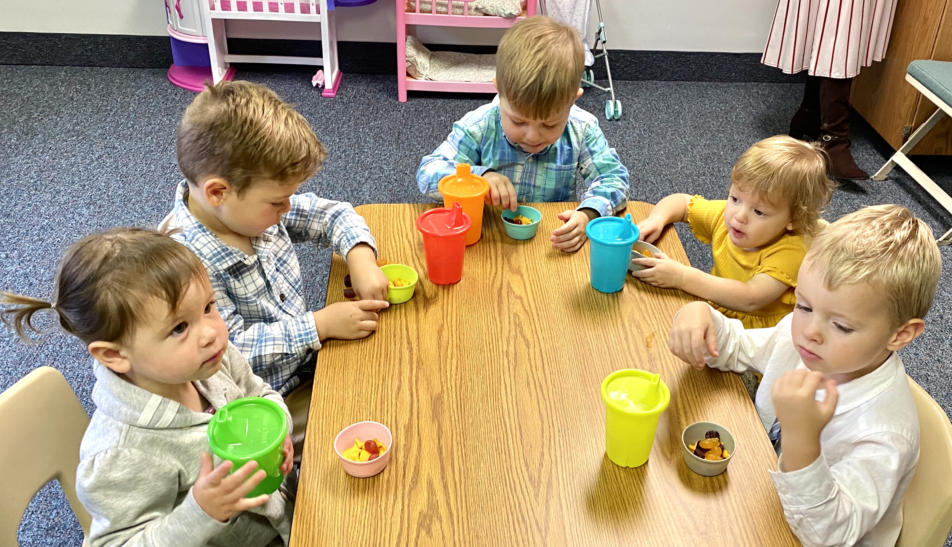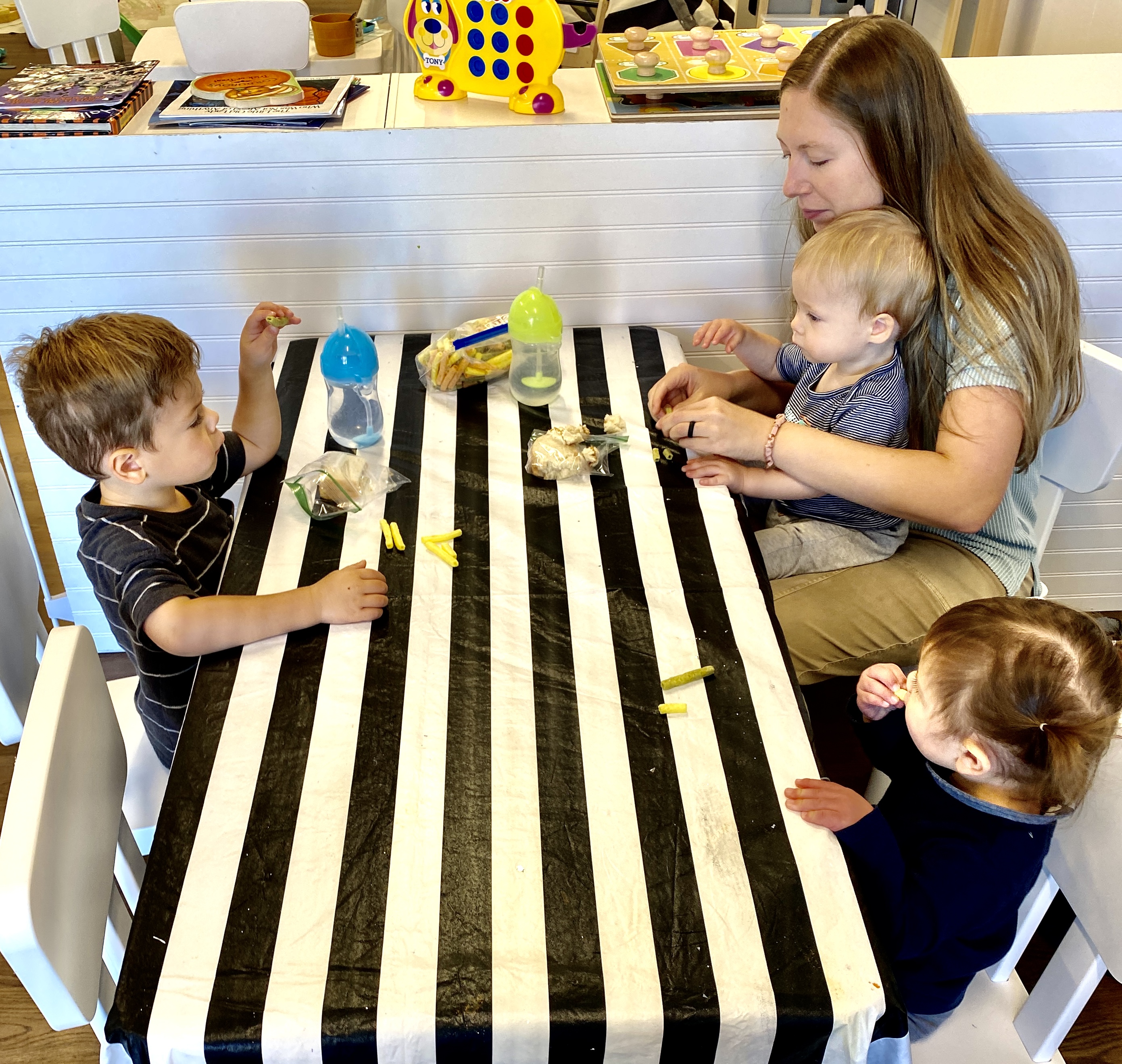 Snack time—the only one missing is Gus who wasn't old enough to attend nursery yet.