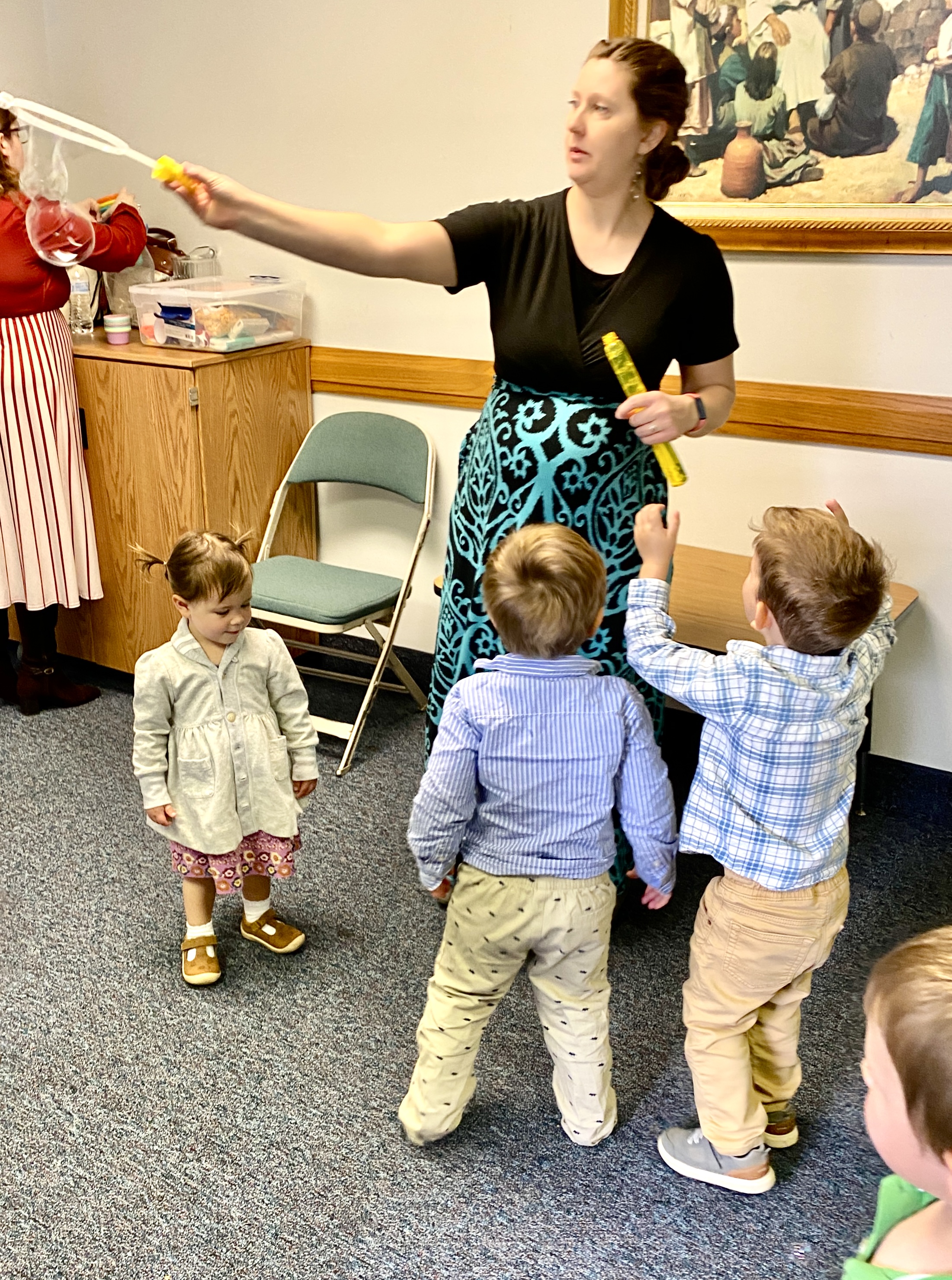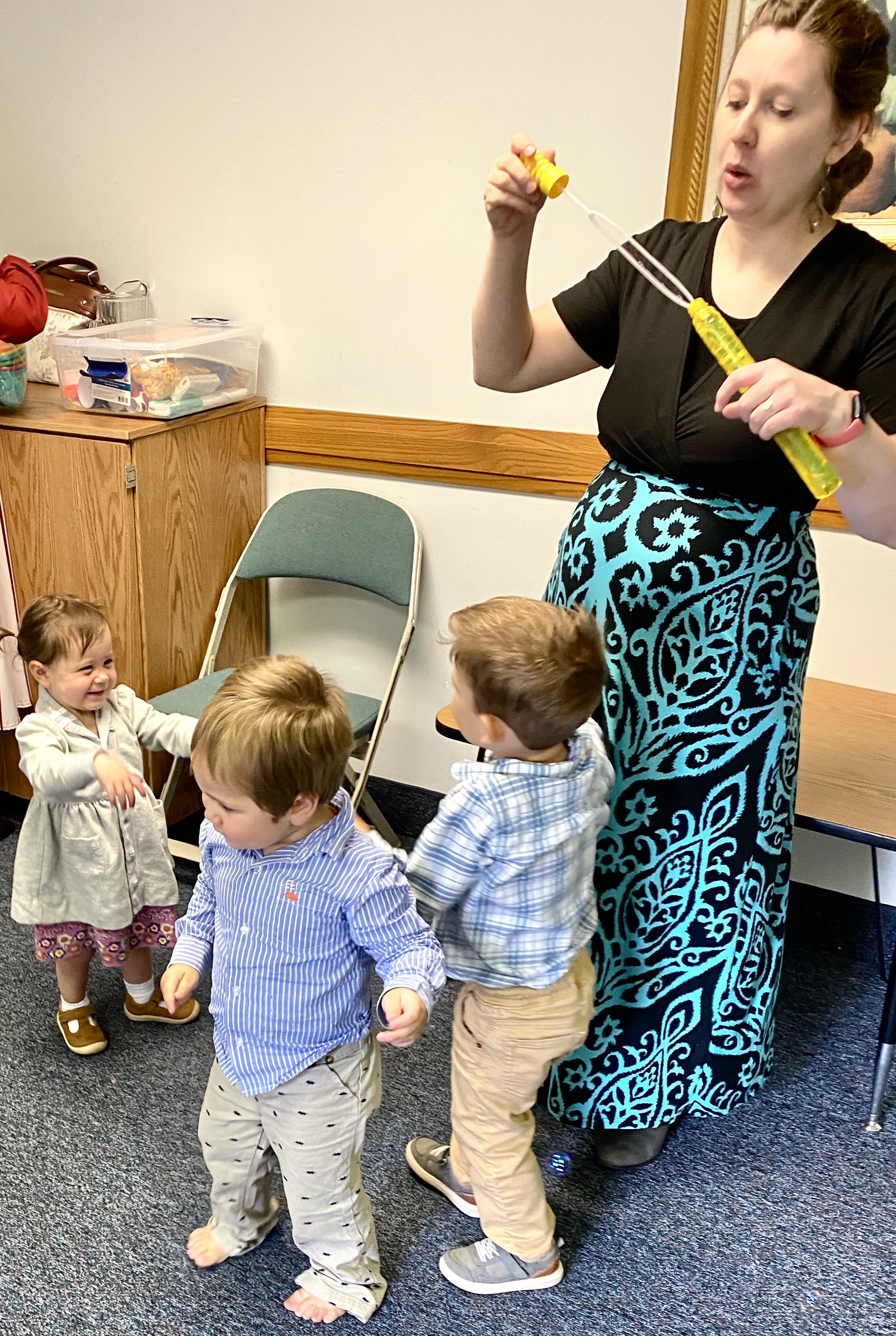 Aubrey helping Finn re-fill his bubble-wand.