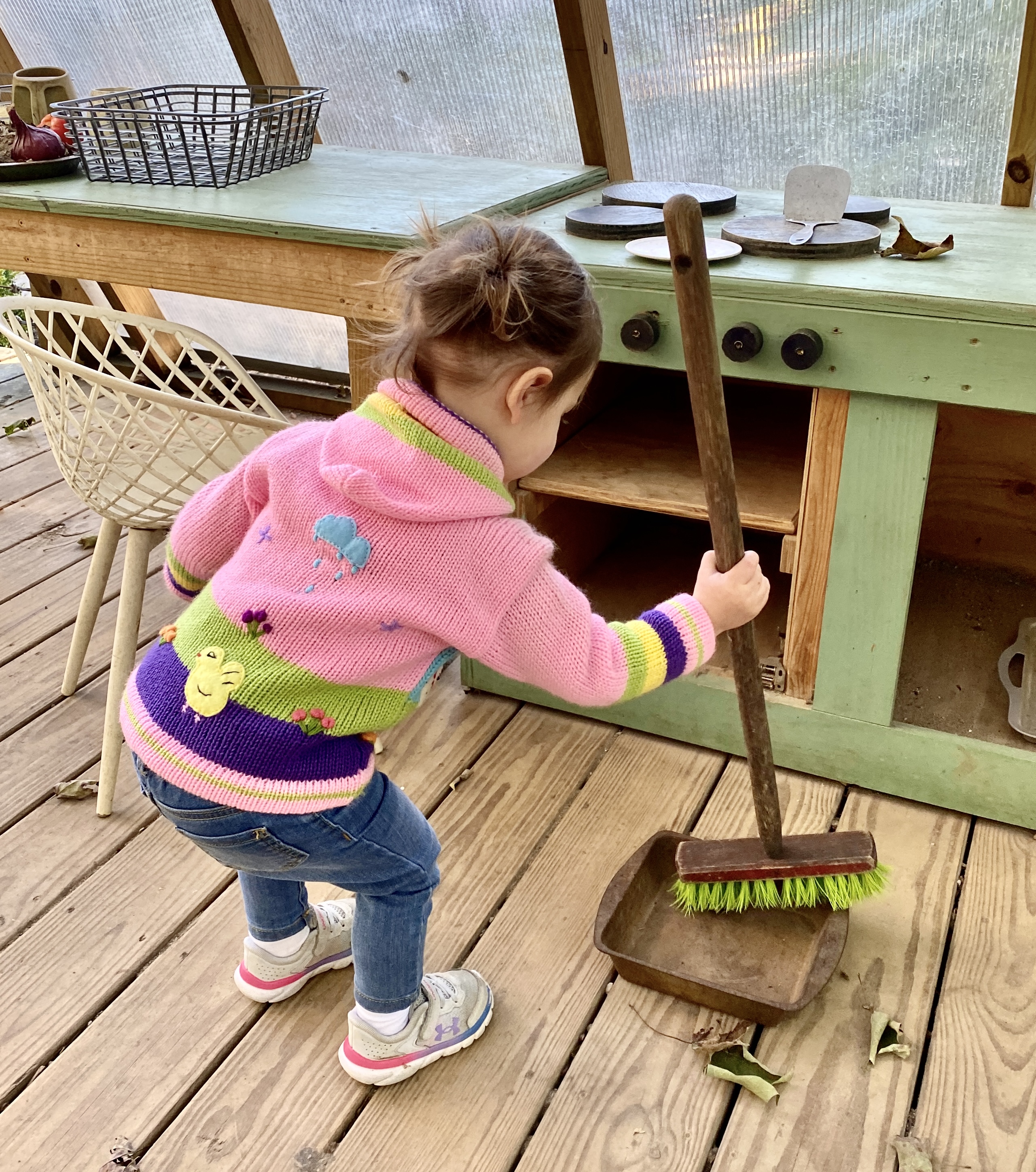 Claire cleaning up a different kitchen on a raised covered deck.