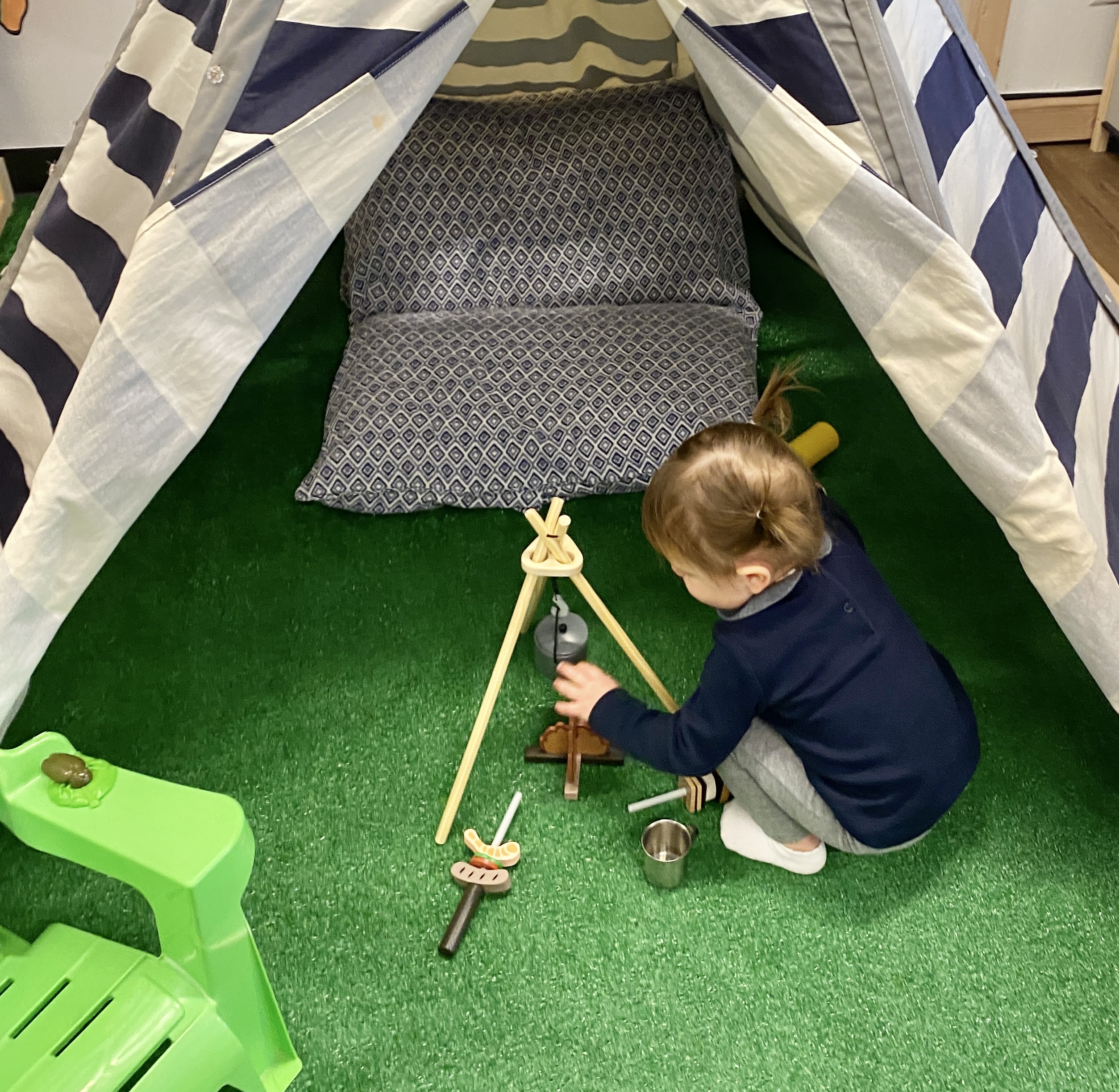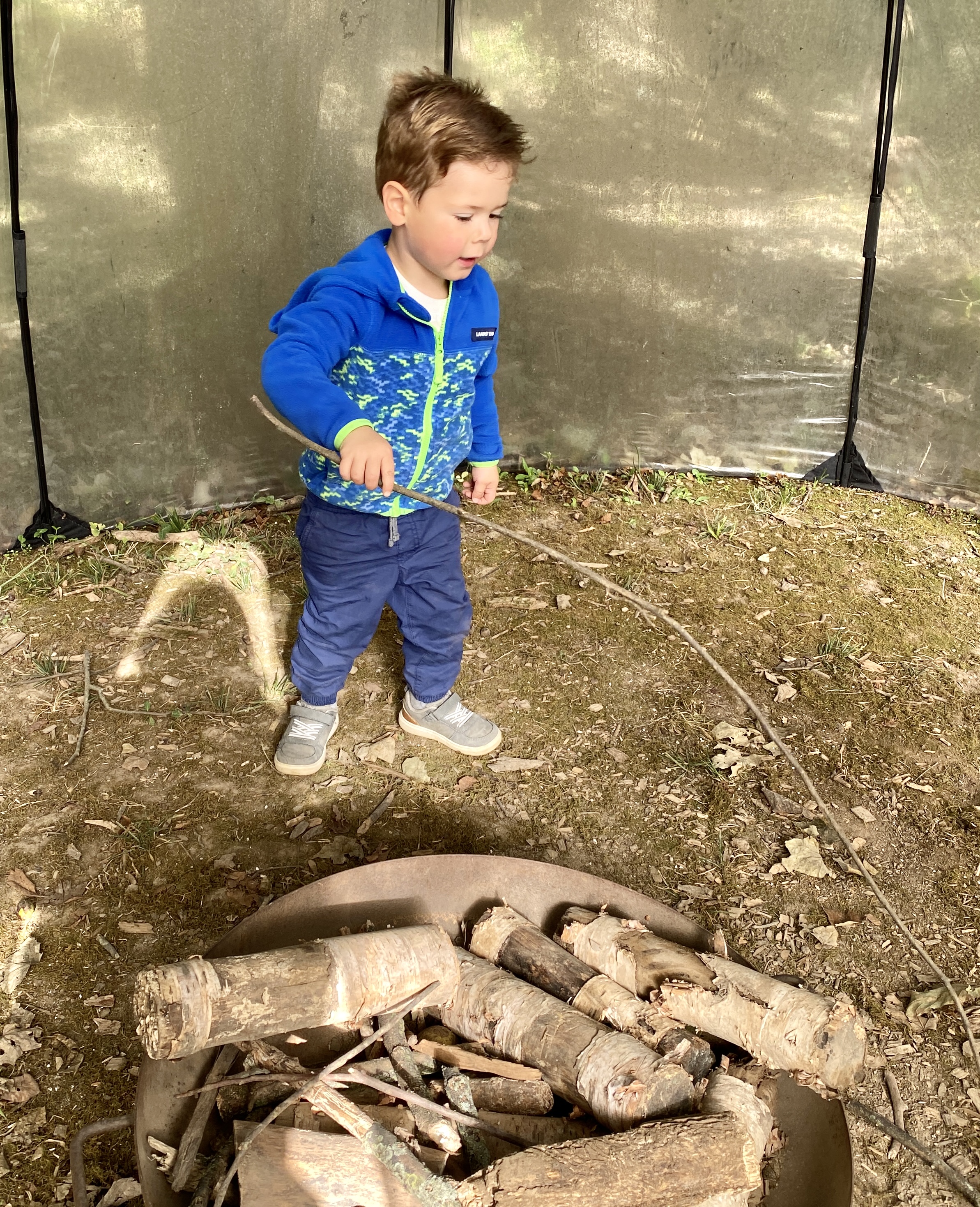 Finn stroking the “fire” in a real tent.