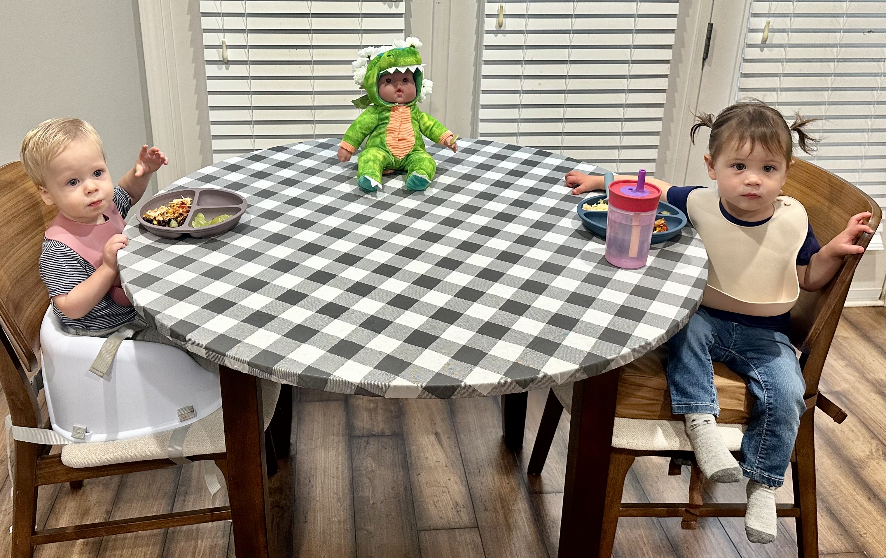 Gus and Claire eating lunch together at the table. Keven—Claire's doll in between—is serving as a nice ice breaker for the them!