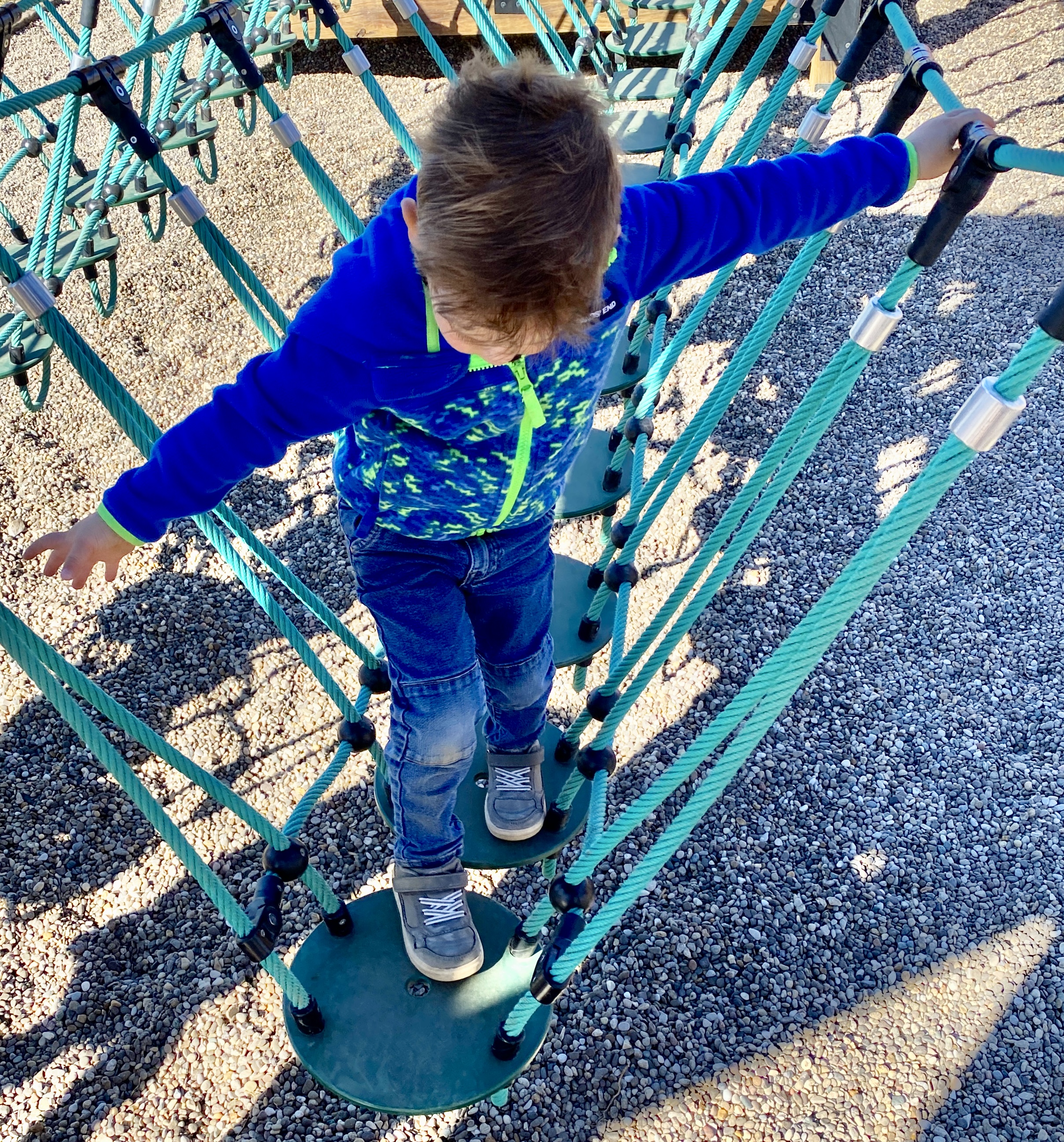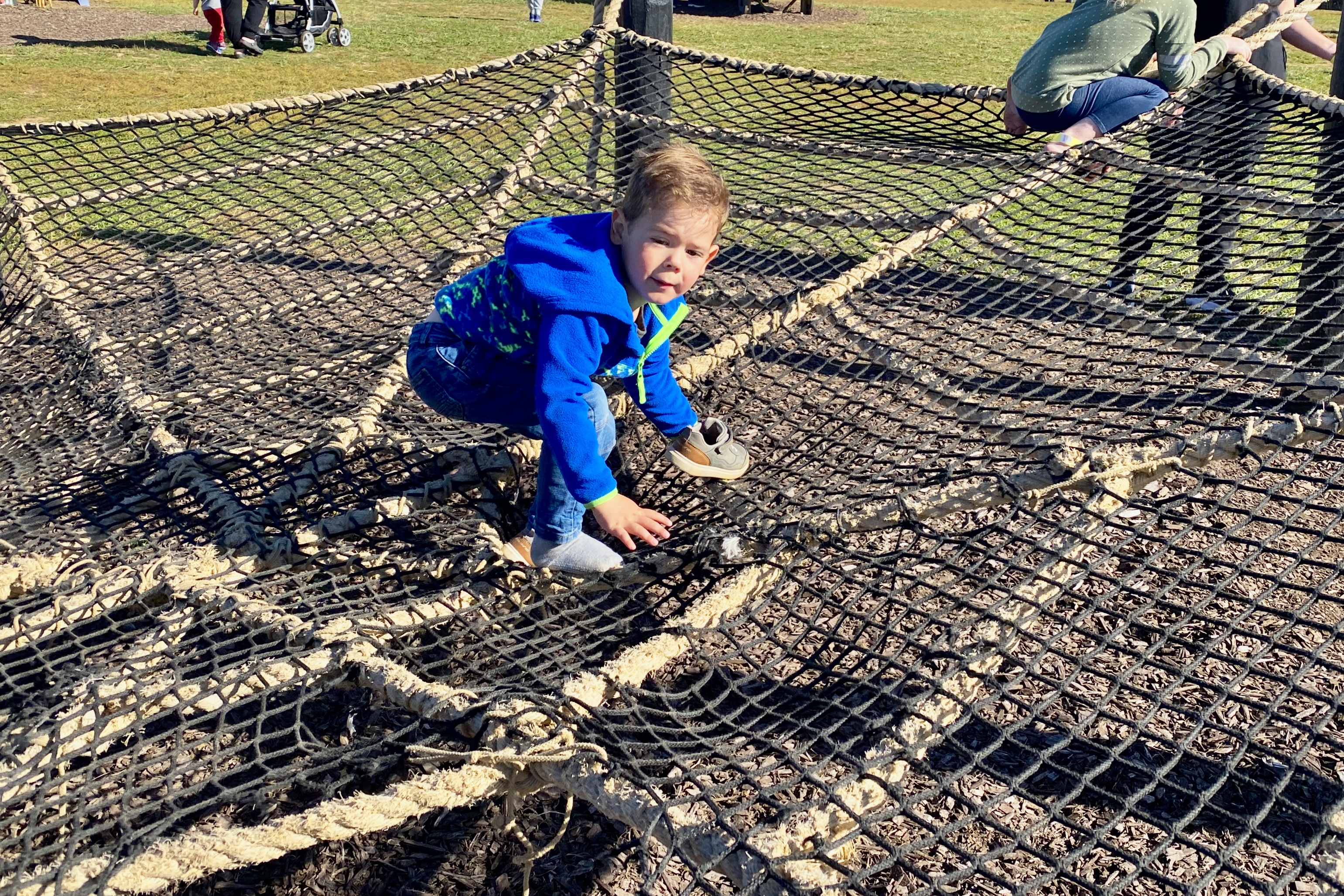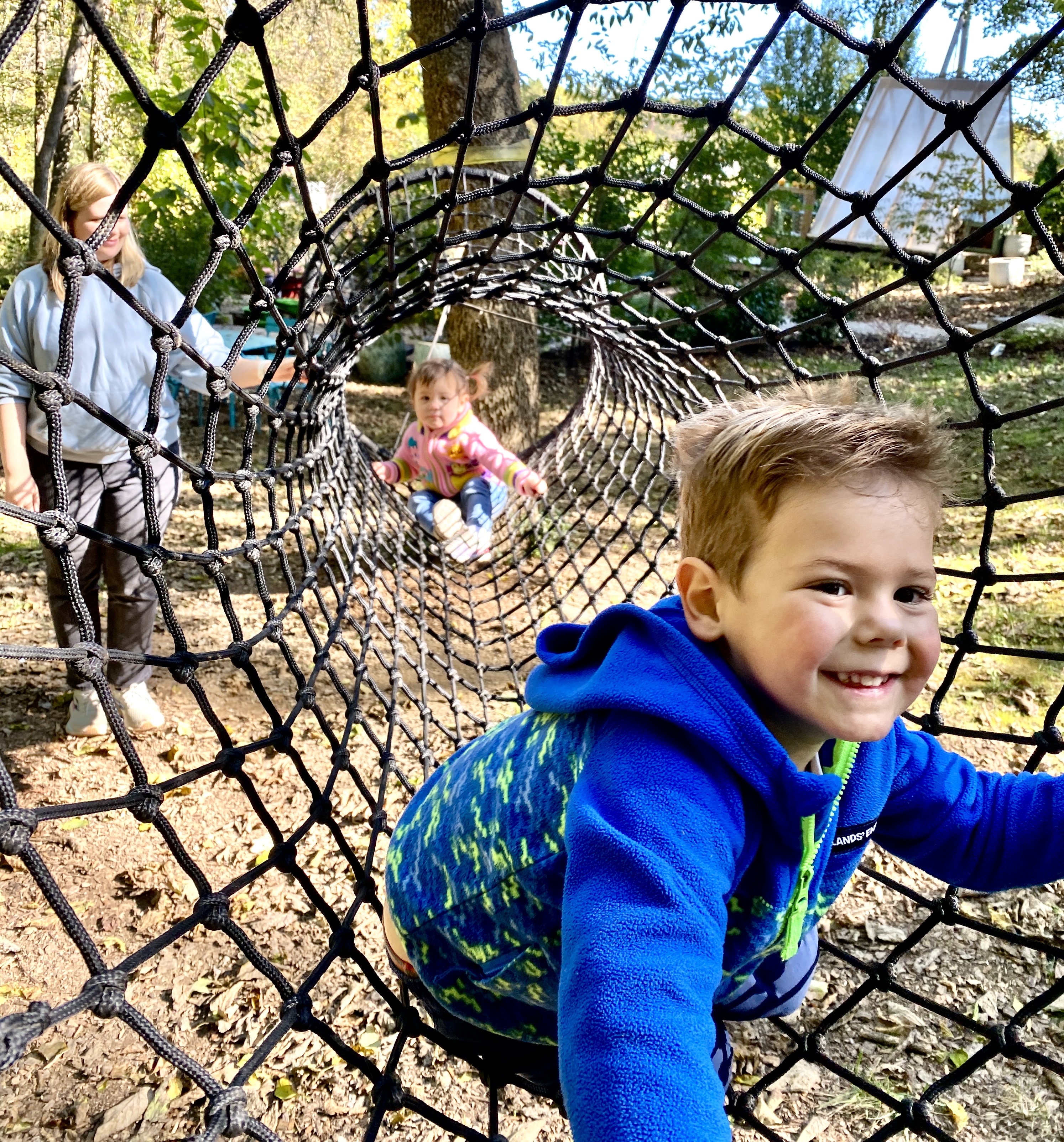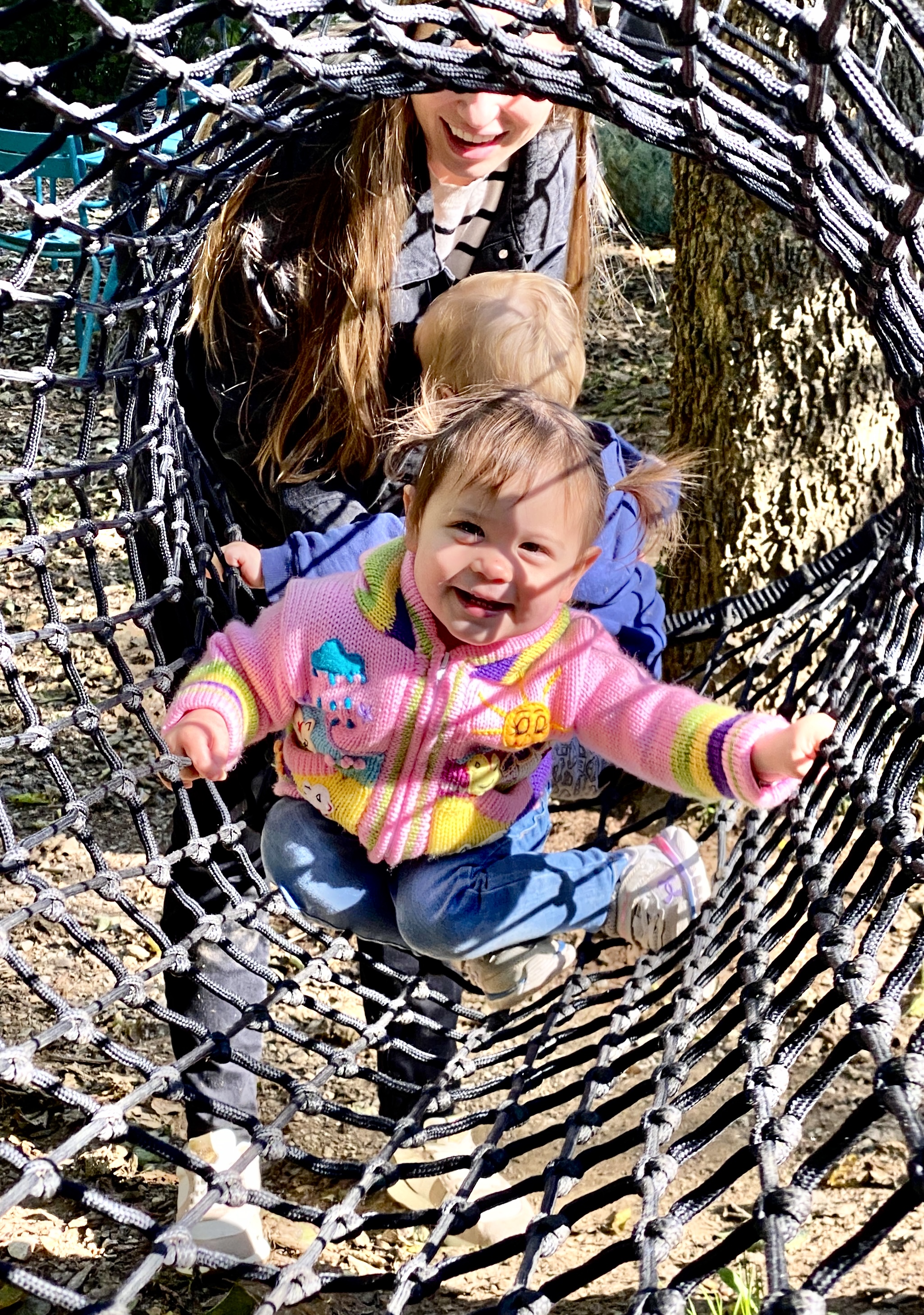 Claire and Finn climbing in a tube made of rope that would twist up-side-down if you weren't careful.