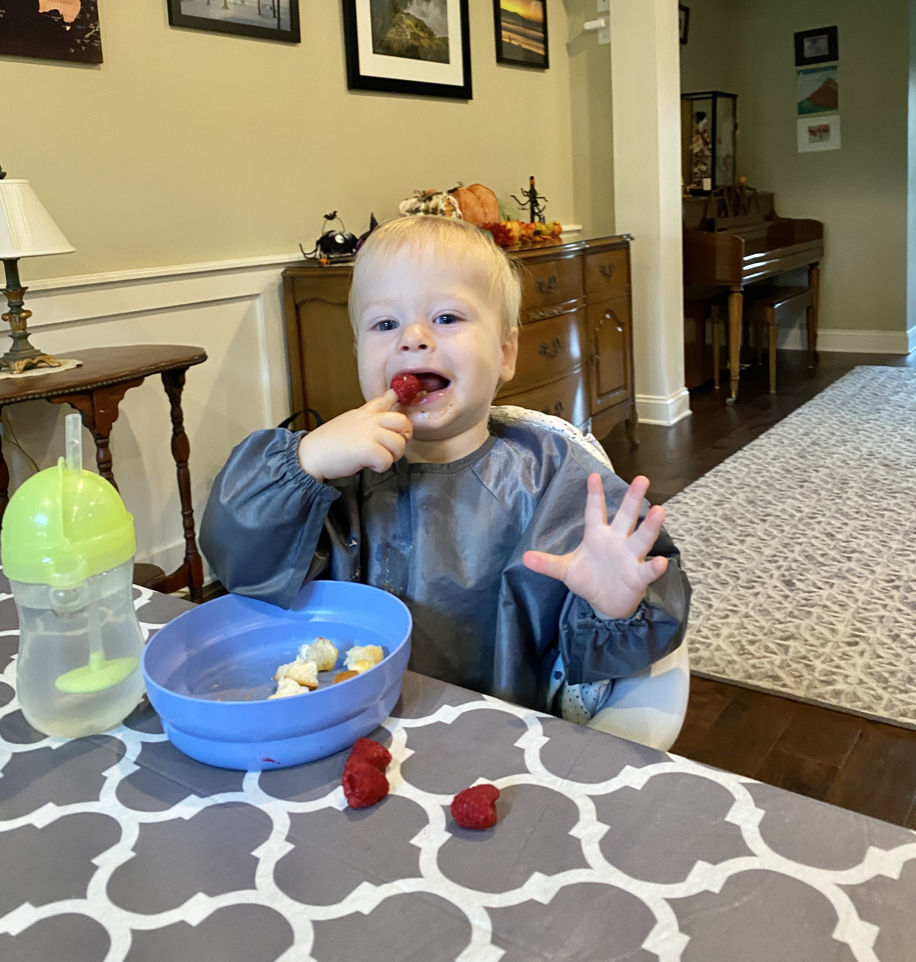 Finn still blowing bubbles in our tiny house.