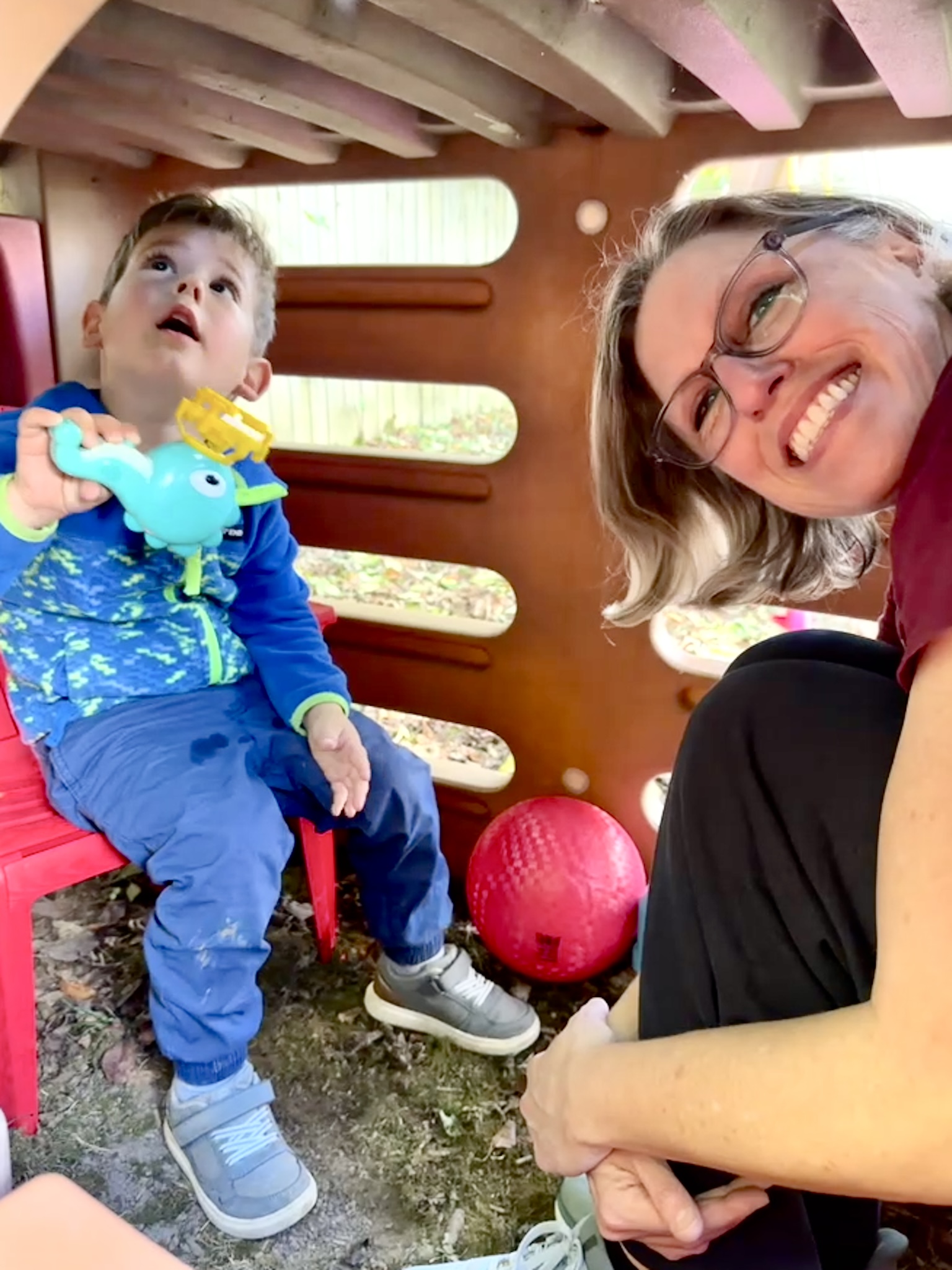 Finn talking Mimi into hanging out with him in his “house” under the slide (and it was tight!).